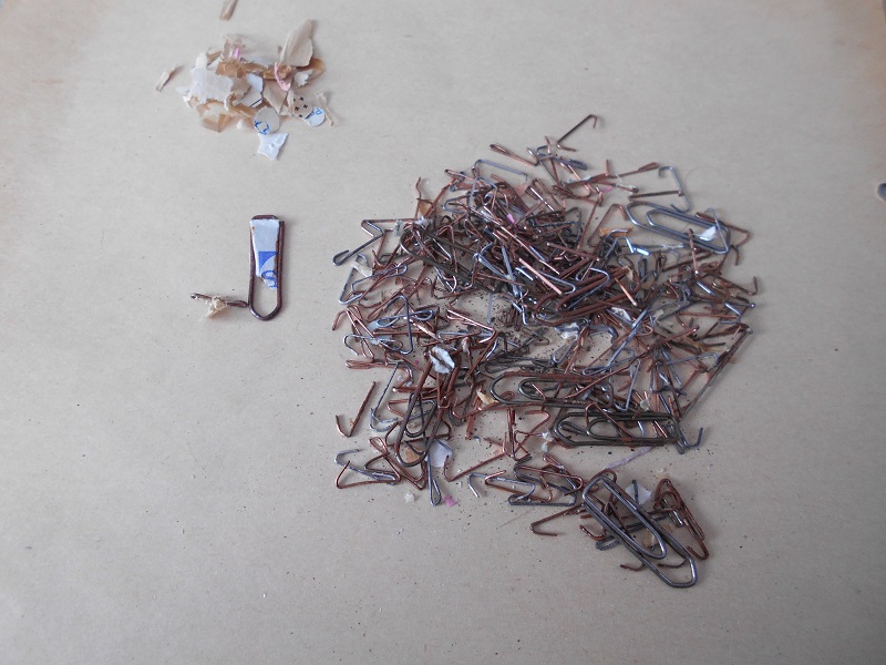 Heftklammern, Büroklammern und andere Fremdstoffe (Tesafilm, Aufkleber...). Was sich in einem Aktenordner an Metall befindet, zeigt das nachfolgende Bild: